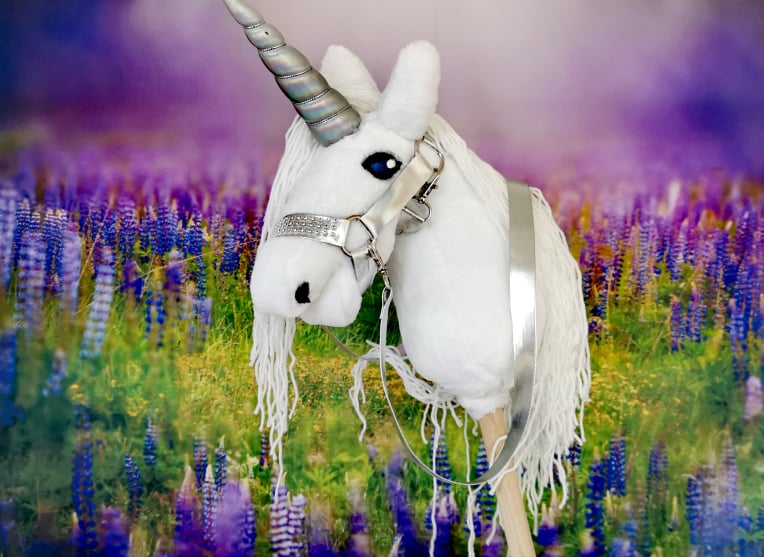 Unicorn jednorożec Hobby horse wykonany z materiału imitującego sierść konia.