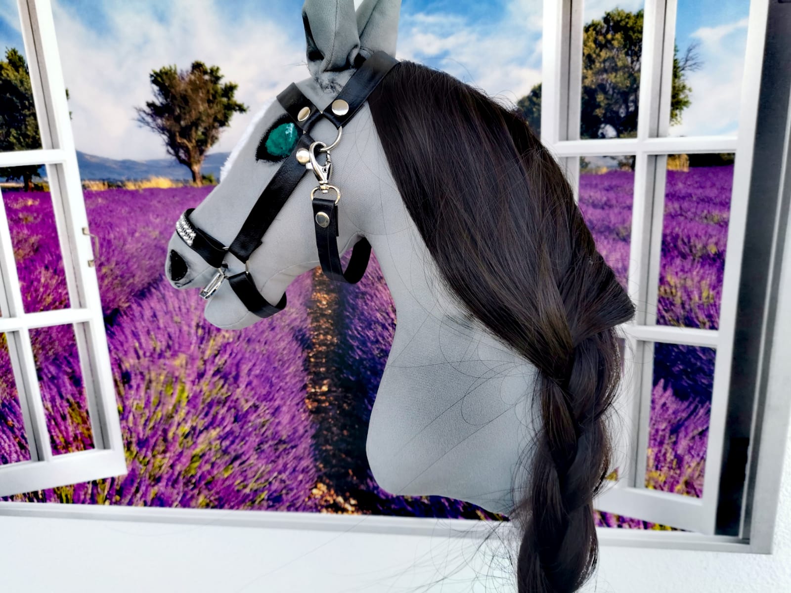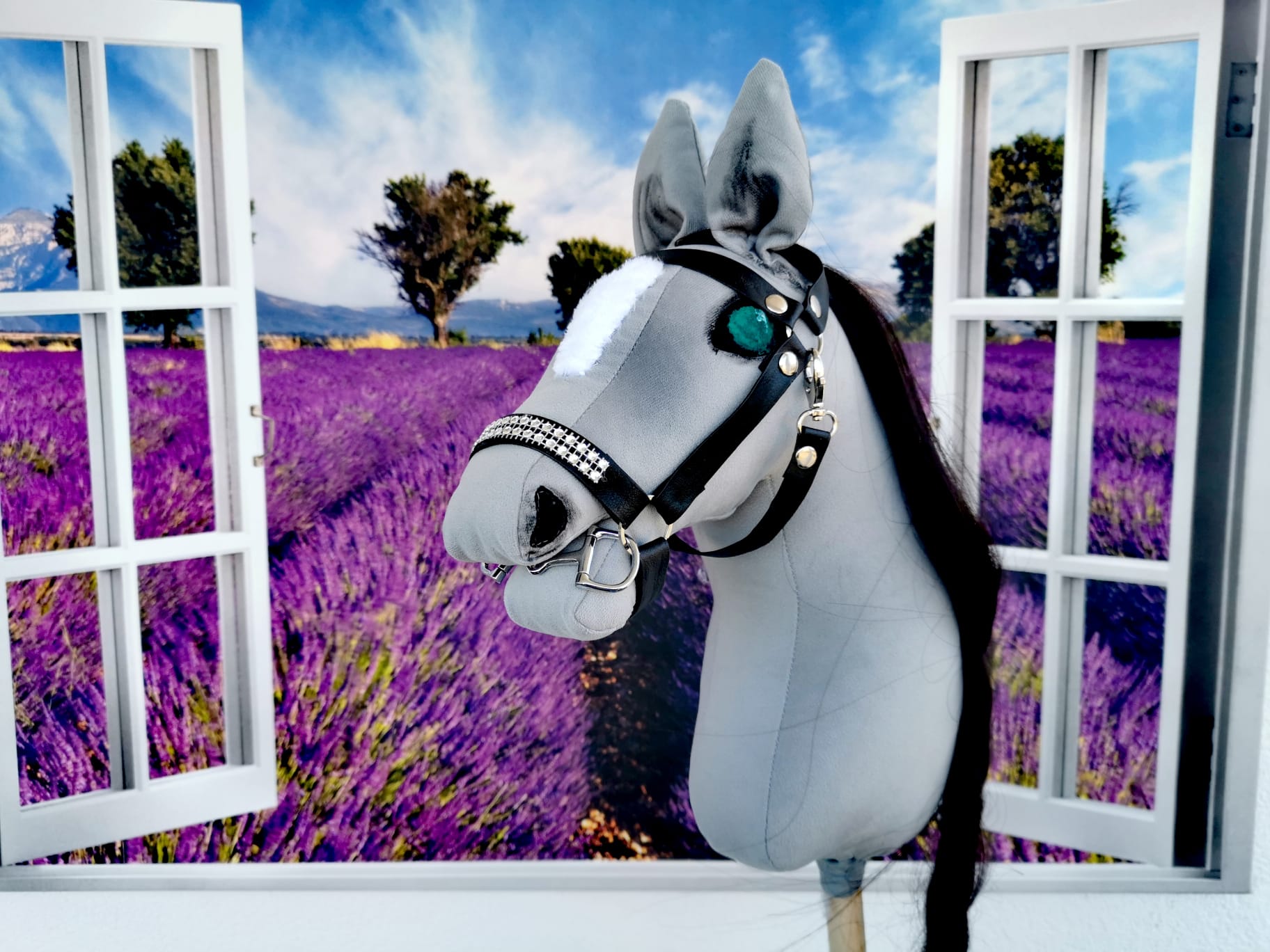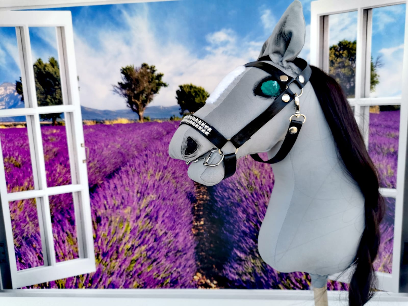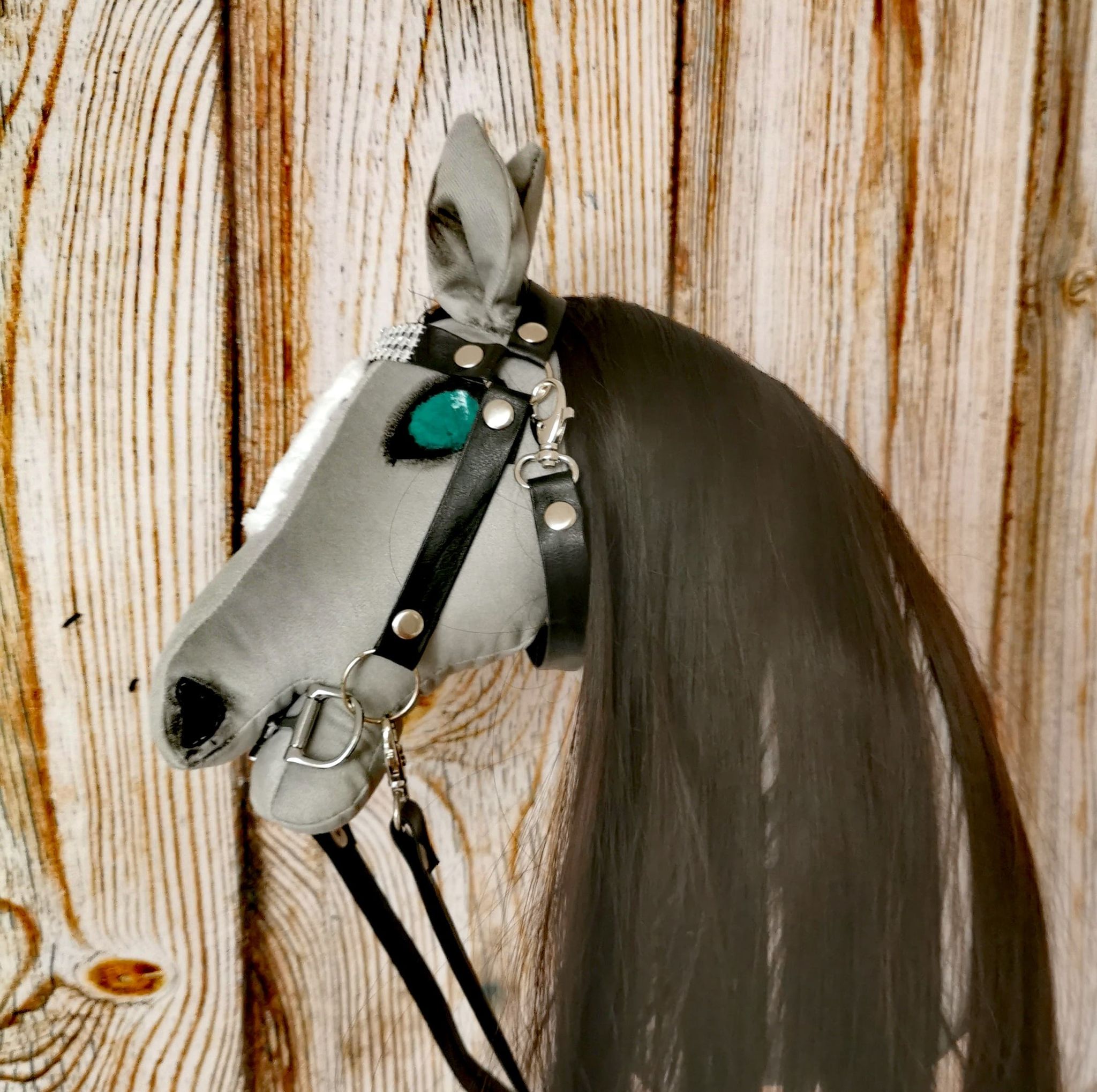 Konik jest koloru stalowego. Oczy zielone i czarne nozdrza. Malowany ręcznie bezpiecznymi farbami dla dzieci.